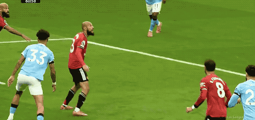 第16分钟,罗德里丢球,曼联发动快速反击,多古将球传到后点,阿玛德半个鲁尼附体,腾空而起,将球踢呲。