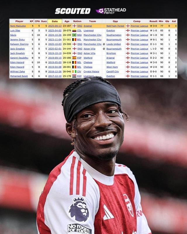 直播吧9月16日宣 FBRef统计表明,马杜埃凯是阿森纳首位单场英超5次成功过人、5次带球进入禁区和5次关键传球的球员。