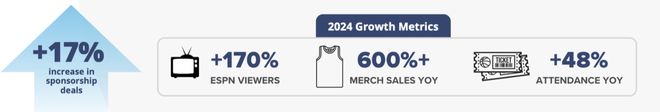 不过,鉴于2024赛季在市场上的火爆程度,WNBA进一步扩大赛事规模并非毫无依据。根据体育赞助交易平台Sponsor United近期的报告《2024&2025赛季 WNBA赞助报告》,WNBA的收视率、商品销售和现场观赛人数在2024赛季都迎来了显著增长。其中,转播平台ESPN的WNBA观众人数年同比增长了170%,赛事周边的商品销售额年同比飙升超过600%,总上座人数也创下了二十二年来的新高,年同比增长了48%。