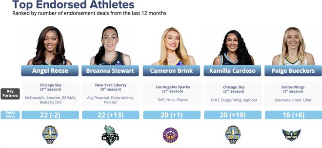 因此,察觉到投资WNBA可以获得高回报的品牌方,接二连三地与球员达成合作,并特别选择了可以和大部分联盟受众群体达成共鸣的年轻面孔。就如同报告所展示的数据,在过去12个月内达成最多代言交易的球员中,有四位正处于新秀赛季或者是第二年。当中,拥有现役WNBA球员中最多粉丝的安吉尔·里斯(Angel Reese) 的代言交易数量与布里安娜·斯图尔特(Breanna Stewart)持平,二人同时以22个代言交易并列第一。虽说斯图尔特已经进入了自己在WNBA的第九个赛季,但两届 MVP、六届全明星、三届 WNBA 冠军和四届 NCAA冠军的荣誉确保她依然是赞助商眼里的“香饽饽”。
