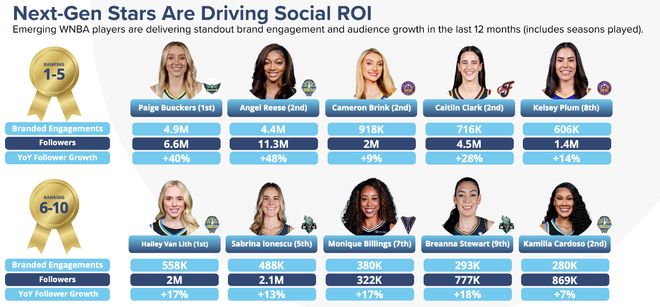 数据显示,在社媒投入产出比 (Social ROI)最高的十大球员中,新秀佩琪·布克斯(Paige Bueckers)以490万次的品牌相关互动(Branded Engagements) 名列榜首,随后紧跟不舍的是品牌相关互动达440万次的二年级生安吉尔·里斯(Angel Reese)。在这之后,同样处于WNBA第二个赛季的卡梅隆·布林克(Cameron Brink) 和凯特琳·克拉克(Caitlin Clark)分别以91.8万和71.6万次的品牌相关互动分别位列第三和第四。值得一提的是,在这十名球员中,共有六名都是初来乍到的‘新一代球星’(指24或25赛季出道),而有四名都进入了前五。