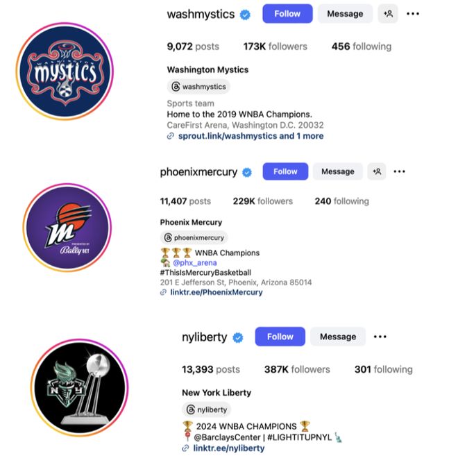 同时,迄今为止赞助最多、拥有最多社媒粉丝的球队往往都成正比,体现了赞助商对球队传播度、影响力的看重。其中,印第安纳所狂热(Indiana Fever) 分别以92家赞助商、310万粉丝的成绩名列赞助商人数和粉丝数的榜双首。而各自排名第三的芝加哥天空 (Chicago Sky) 拥有57家赞助商和140万的社媒粉丝。相比之下,拥有第二多赞助商的华盛顿神秘人(Washington Mystics) 、第四多赞助商的纽约自由人(New York Liberty),以及第五多赞助商的菲尼克斯水星队 (Phoenix Mercury) 都没有进入拥有最多社媒关注者榜单的前五。不过,这三家球队的共同点是均获得过WNBA联赛的冠军,拥有着众多支持团队的死忠粉。