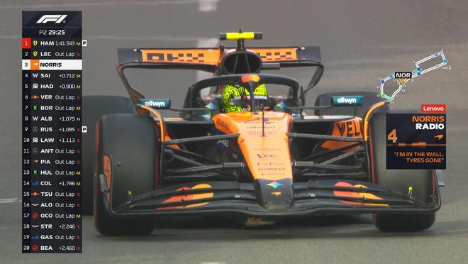 二练时间过半,诺里斯的左后轮蹭墙,导致悬架受损,他将赛车缓慢开回维修区;