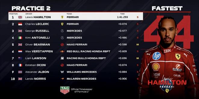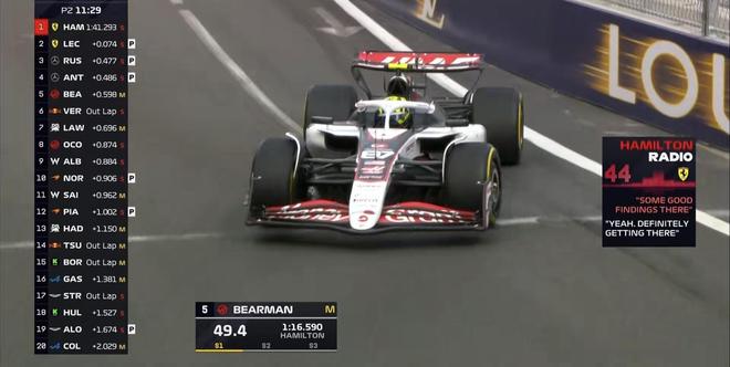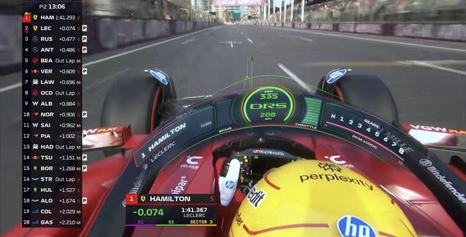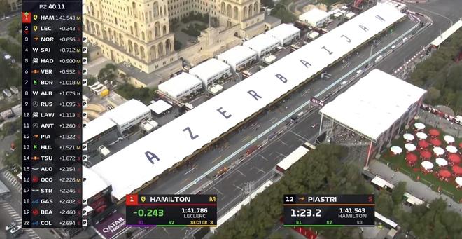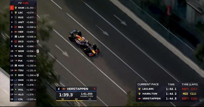 二练剩余13分钟,汉密尔顿旧软胎再飞一圈,借到勒克莱尔的尾流成功来到榜首,这个成绩已经超过了队友在去年的杆位成绩!
