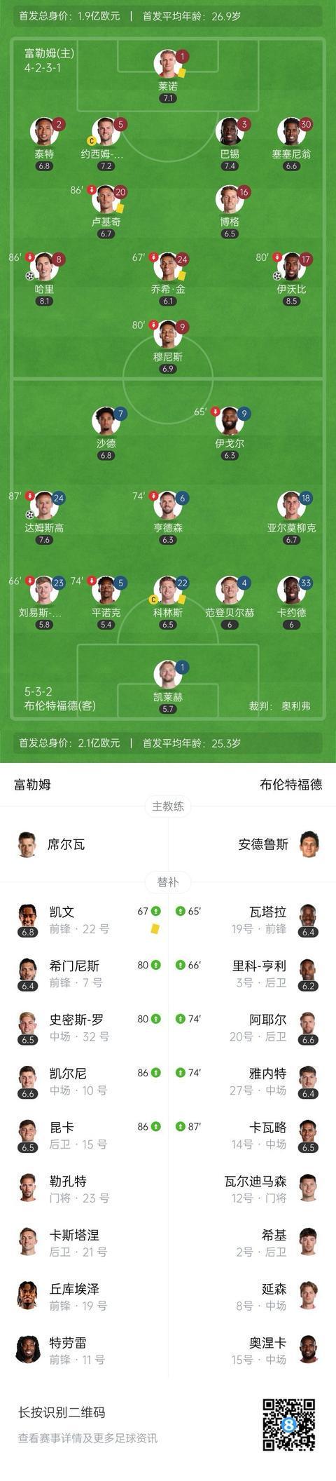 最终富勒姆3-1击败布伦特福德收获英超两连胜。