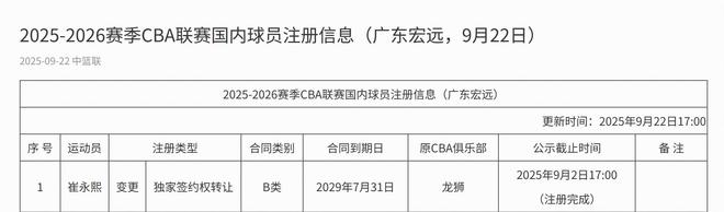 北京时间9月22日,CBA官网更新注册信息,广东男篮成功注册崔永熙,这意味着球员正式回归CBA。