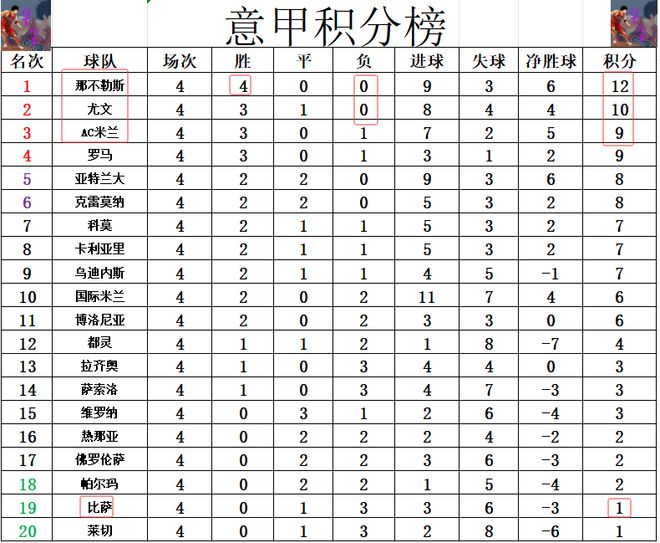 积分榜方面,那不勒斯今天小胜比萨后,成为新赛季唯一保持全胜的球队,超过尤文,AC米兰夺回榜首,多尤文2分,多AC米兰3分。比萨输球后,还是倒数第2陷在降级区。