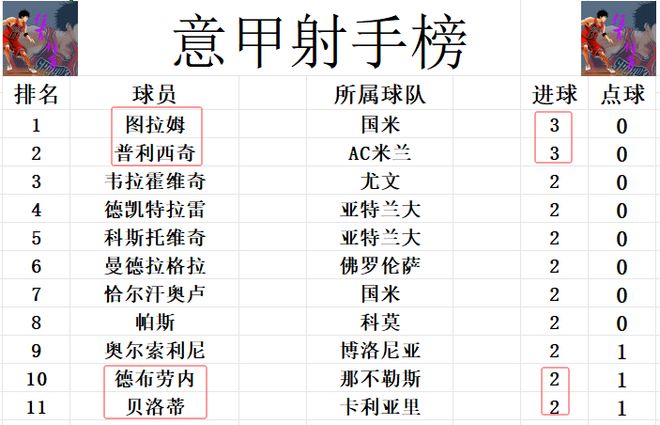 射手榜方面,图拉姆,普利西奇3球并列榜首。德布劳内今天没有进球,就还是和韦拉霍维奇,德凯特拉雷,贝洛蒂,恰尔汗奥卢等人2球位列前十。