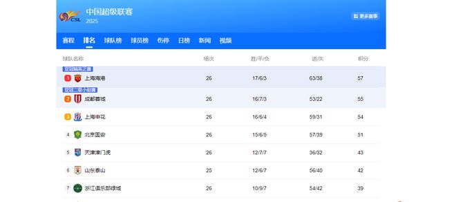 截至中超第26轮赛程,积分榜前四球队分别是57分的上海海港、55分的成都蓉城、54分的上海申花,51分的北京国安。