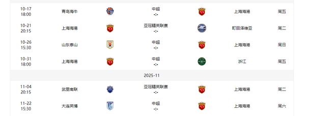 上海海港最后四轮1主场3客场,对手是青岛海牛、山东泰山、浙江队、大连英博