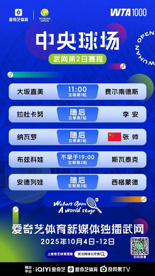 北京时间10月7日,爱奇艺体育新媒体独播的2025武汉网球公开赛第2日赛程精彩绝伦。