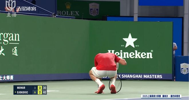 第二盘前11局,双方互相保发,来到德约非保不可的发球局,德约被穆纳尔破发的瞬间,这位38岁的老将无奈躺在了地上。盘间休息,理疗师上前为德约开始量血压……双方大比分来到1比1,对于德约而言,再打一盘简直是噩梦……