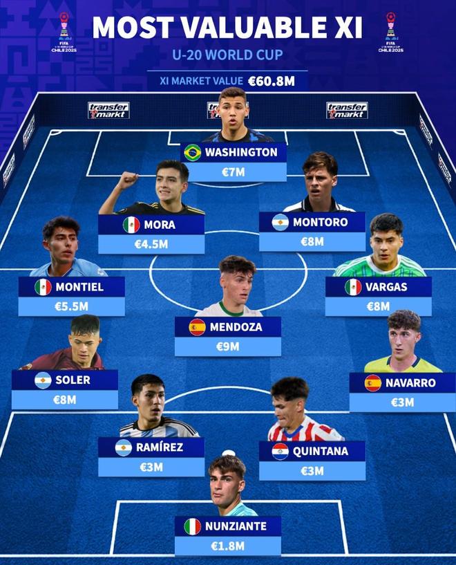 北京时间10月10日,德转列出了本届U20世界杯的最贵11人阵容,西班牙U20中场,目前效力于埃尔切的罗德里戈-门多萨以900万欧元的身价领衔,阿根廷队阵中的伯恩茅斯左后卫胡利安-索莱尔和巴西队阵中的切尔西前锋戴维德-华盛顿在列。