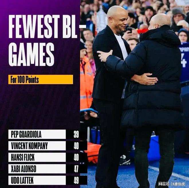 去年夏天孔帕尼非常意外地得到了拜仁帅位后至今,他已经带队参加了40场德甲比赛,累计得分100分,战绩为31胜7平2负。自此,根据赛后德甲官方的数据显示在德甲历史上带队拿到100分所用场次最少的主教练是瓜迪奥拉的39场,而少帅孔帕尼以40场与弗里克并列排名第二。